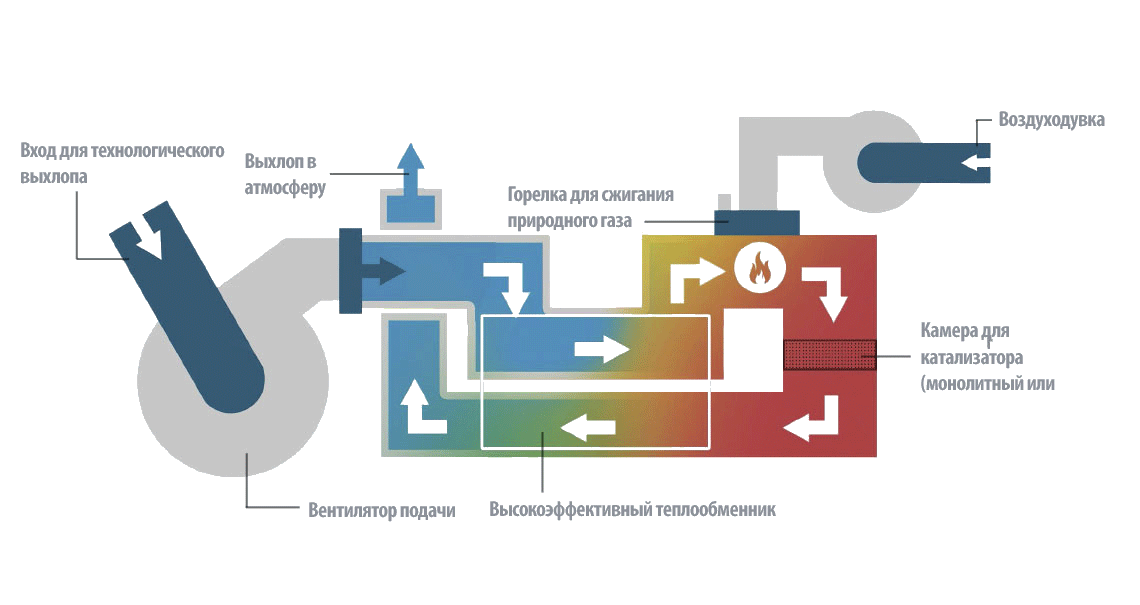 Каталитическое окисление имеет тепловую эффективность более 98% и не потребляет газ при достижении автотермической точки. Это идеальный метод для низких или средних воздушных потоков (1000-30 000 нм3/ч) при средней или низкой концентрации летучих органических соединений (ЛОС) (0,1 – 10 г/нм3), при этом имеет низкие эксплуатационные расходы.
