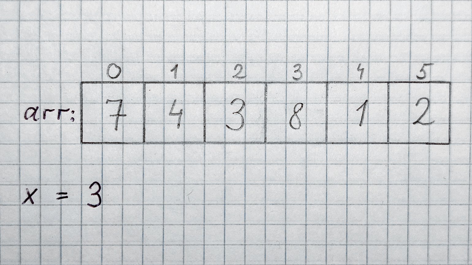 Допустим, у нас есть массив целых чисел arr, содержащий n элементов. Вообще, количество элементов, размер строк, массивов, списков и графов в алгоритмах всегда обозначают буквой n или N. Ещё дано целое число x. Для удобства обусловимся, что arr точно содержит x.