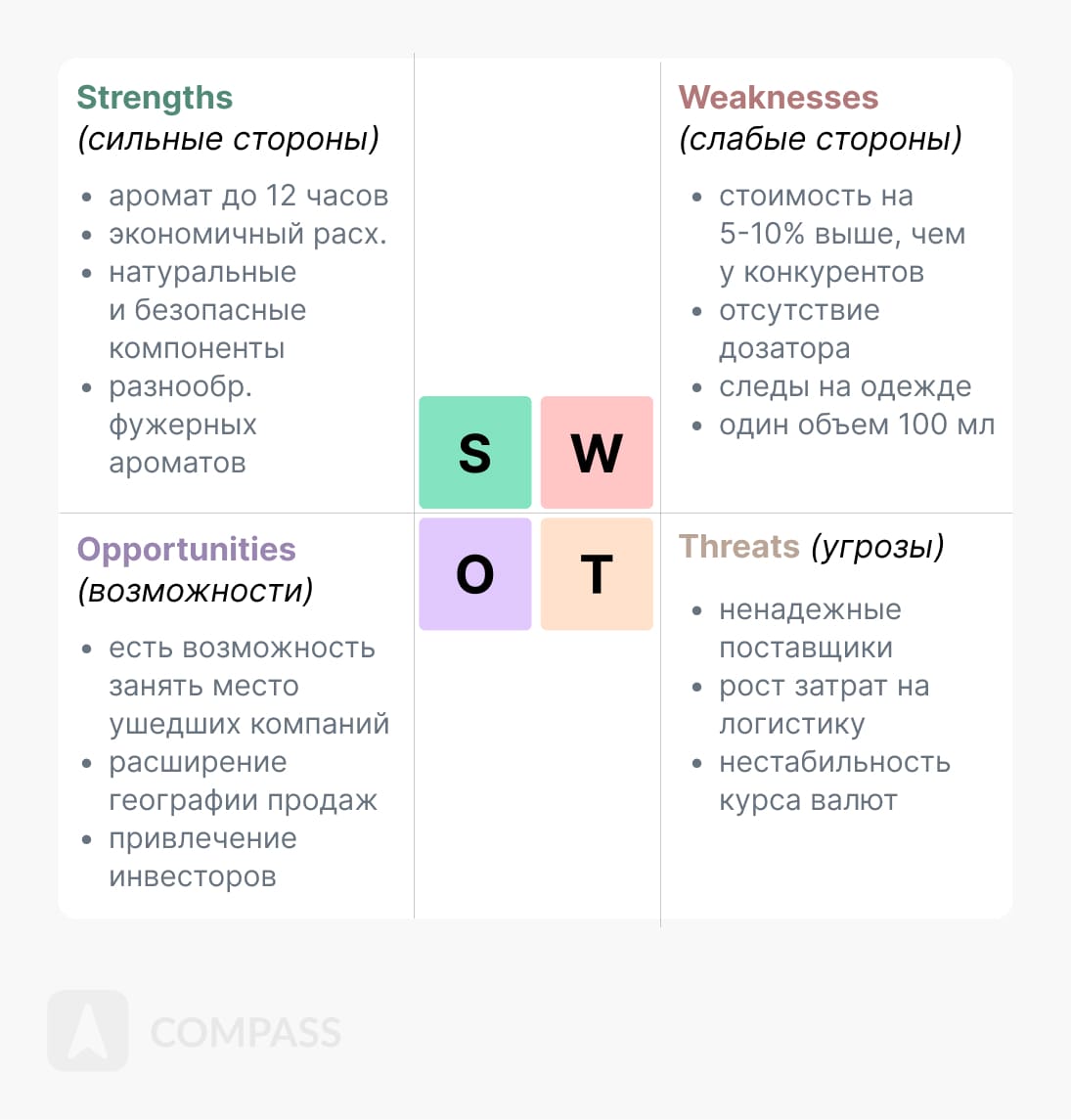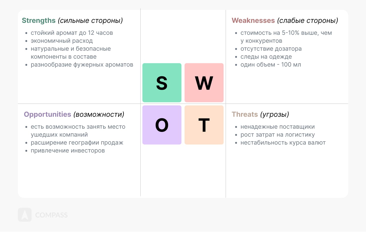 В результате пример SWOT-анализа для новой линии духов будет выглядеть так: