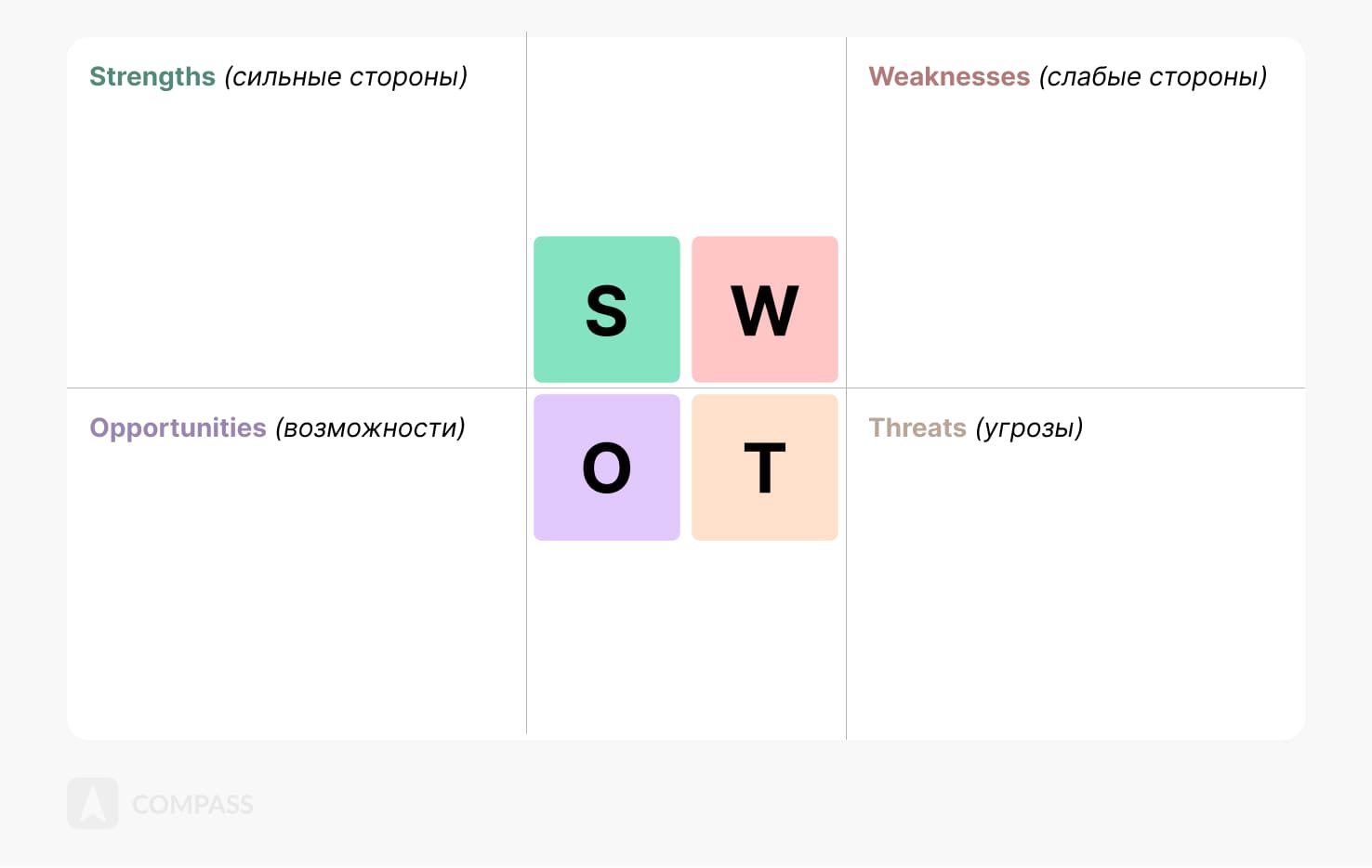 Классическая таблица, или, как ее еще называют, матрица SWOT-анализа, необходима для изучения четырех типов факторов, о которых мы говорили выше. Соответственно, у матрицы SWOT анализа четыре поля, в каждое из которых нужно вписать эти аспекты. Так выглядит шаблон матрицы: