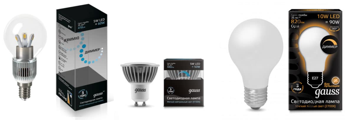 Интересной является серия ламп Gauss Step с шаговым диммированием. Диммер для них не нужен, схема шагового изменения яркости уже встроена в саму лампу. Есть у Gauss и оригинальные решения – лампочки со «спиралью накаливания» из светодиодов.