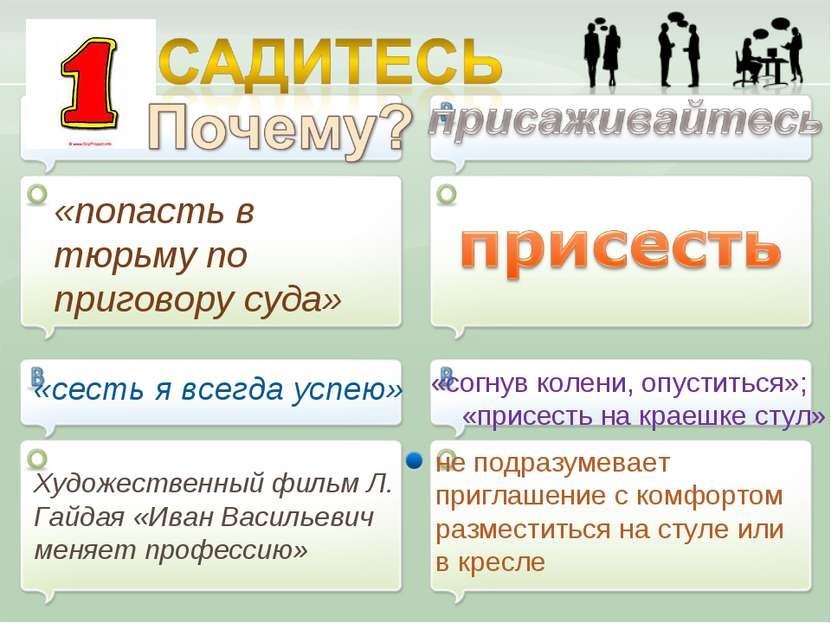 Некоторые слова-сорняки не являются регионализмами, а имеют совершенно другое происхождение. Например, привычка заменять слово «садитесь» на его аналог «присаживайтесь» имеет криминальное прошлое. Помните знаменитые фразы-мемы «сесть я всегда успею» и «кто ж его посадит, он же памятник»?