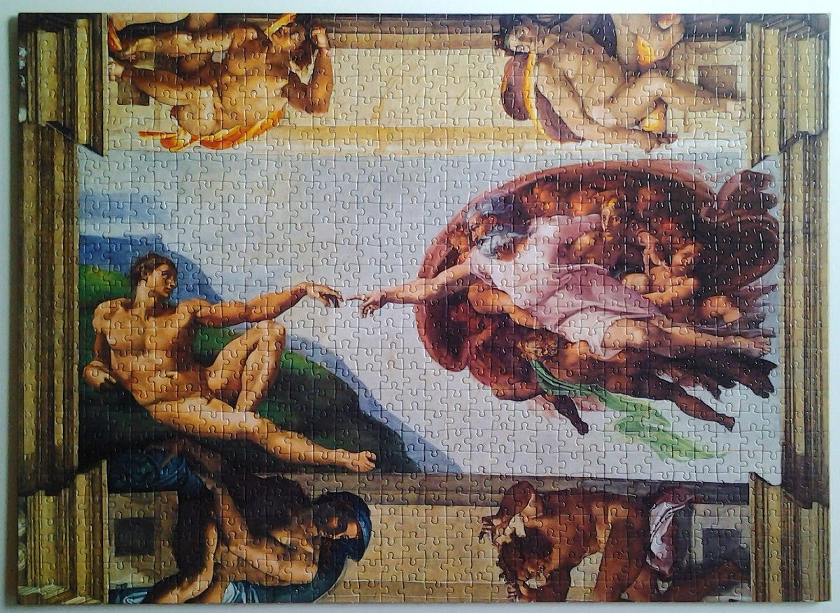 Очень важна та часть работы, где Микеланджело изображает встречу или союз указательных пальцев Бога и Адама. Так как их разделяло небольшое расстояние. Хотя позиция Адама по отношению к Богу-творцу мира очень похожа. Поскольку художник эпохи Возрождения основывался на Бытие 1:27, что Бог создал человека по своему образу и подобию.