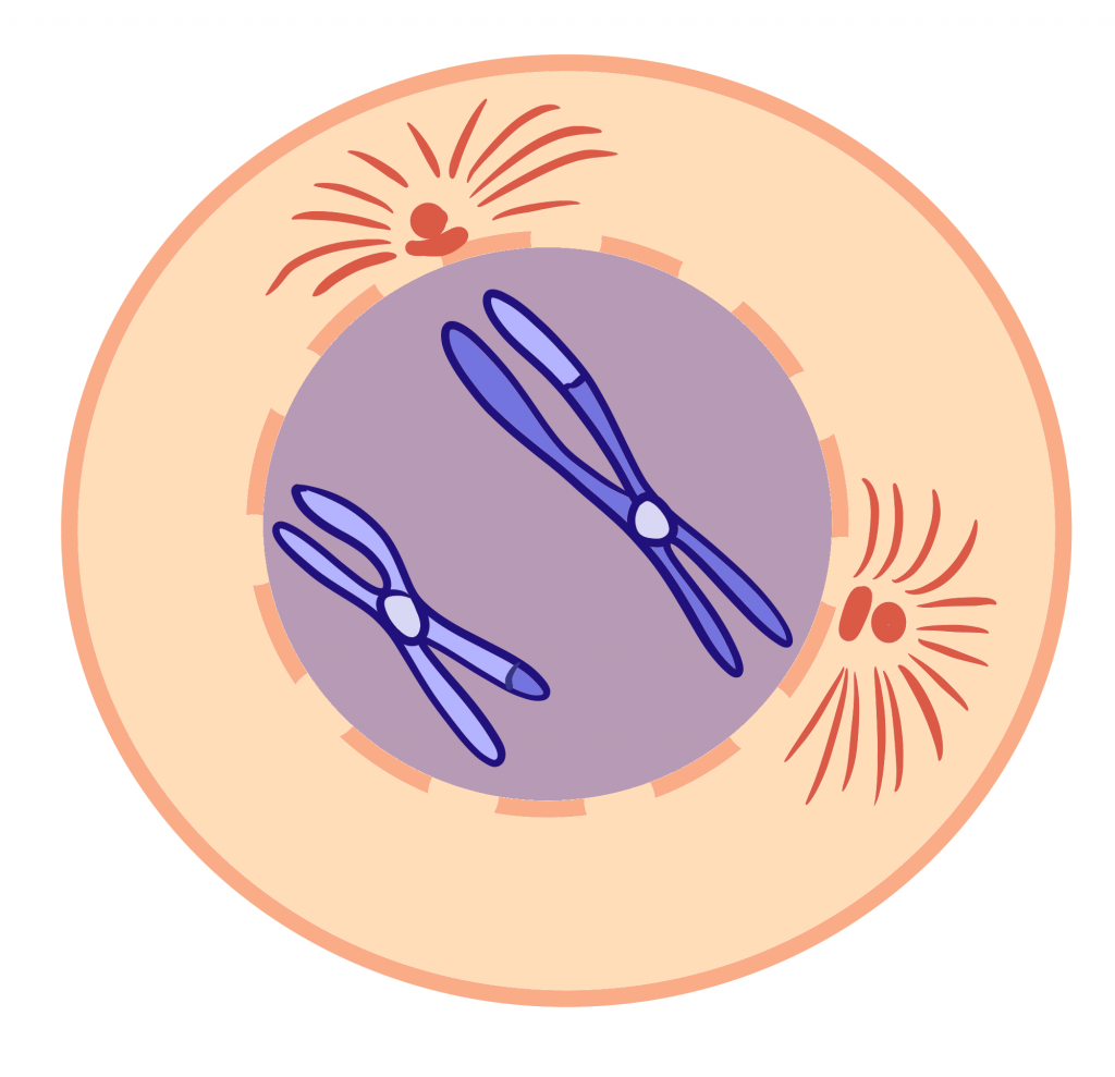 - Профаза II. 1n2c×2. Короткая по продолжительности фаза. На этом этапе разрушается ядерная оболочка, снова исчезают ядра и ядрышки, происходит конденсация хромосом, формируется веретено деления.