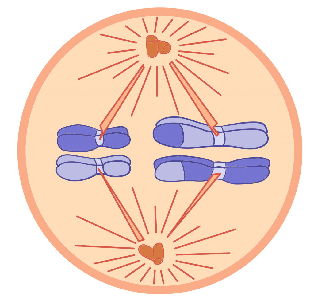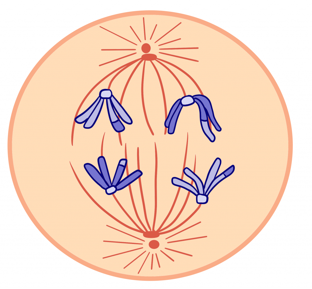 - Анафаза II. 2n2c×2. Центромеры делятся. Однохроматидные хромосомы расходятся к разным полюсам. Теперь сестринские хроматиды являются сестринскими хромосомами.