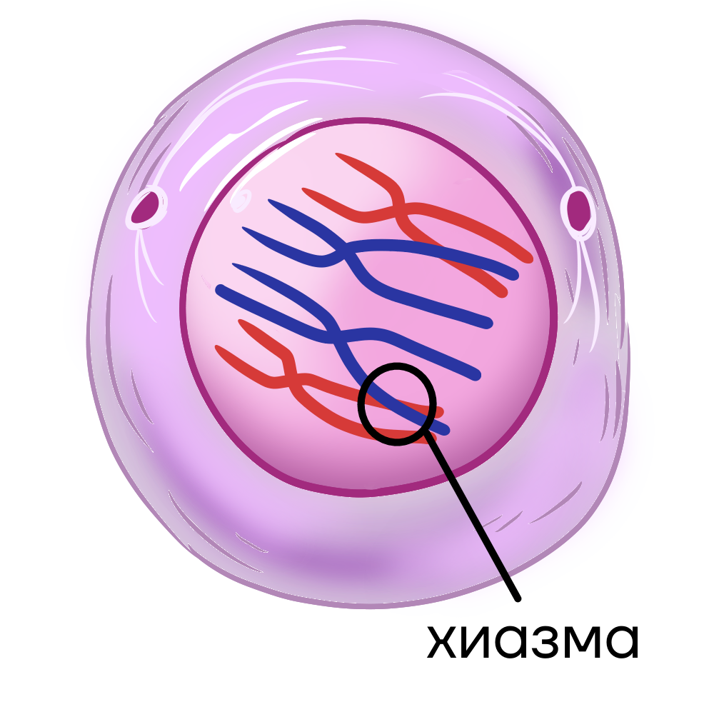 Хромосомы отталкиваются друг от друга в области центромеры, а в области плеч они остаются соединенными. Они как будто бы держатся за ручки парами. Хиазма — точка, в которой две гомологичные несестринские хроматиды обмениваются генетическим материалом в ходе кроссинговера. |