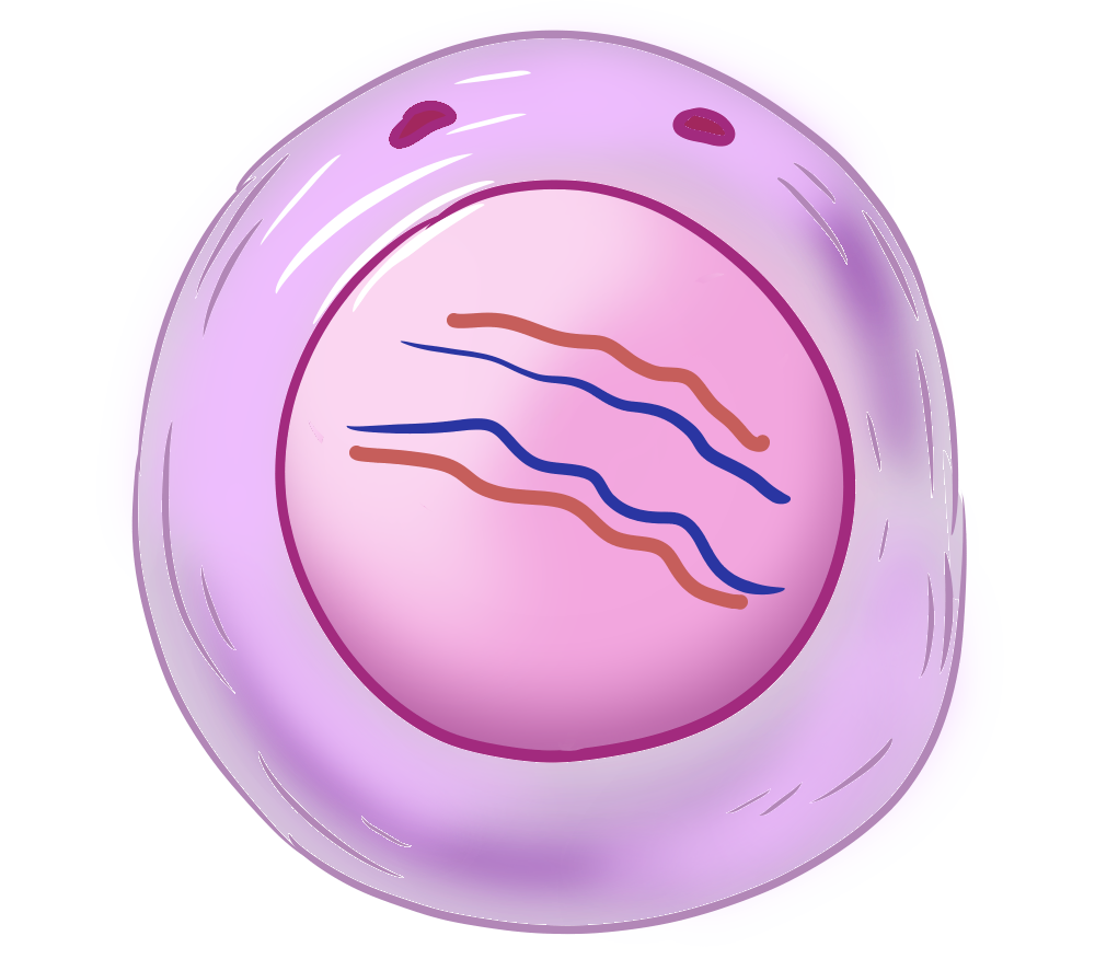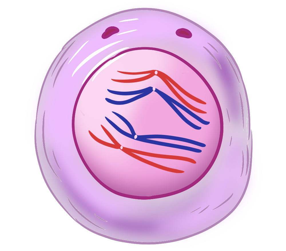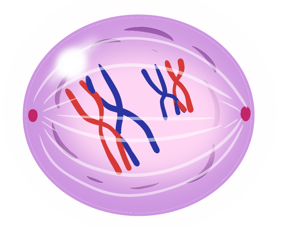 В клетке происходит конъюгация. Во время этого процесса гомологичные хромосомы узнают друг друга и соединяются. Гомологичные хромосомы — это пара хромосом (одна материнская, другая отцовская), которые имеют один и тот же набор генов. Данные гомологичные хромосомы, соединенные в пары, принято называть бивалентами. Оболочка ядра начинает распадаться, к противоположным полюсам клетки расходятся центриоли, начинают образовываться нити веретена деления, ядрышки исчезают. |