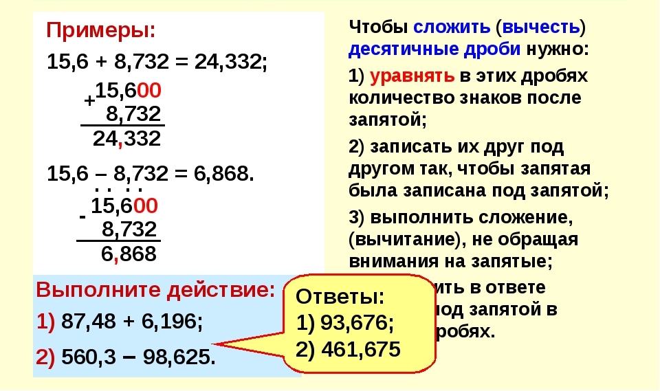 Для сложения либо вычитания десятичных дробей, нужно записать их в столбик, запятая под запятой, и уравнить количество десятичных знаков если это требуется.