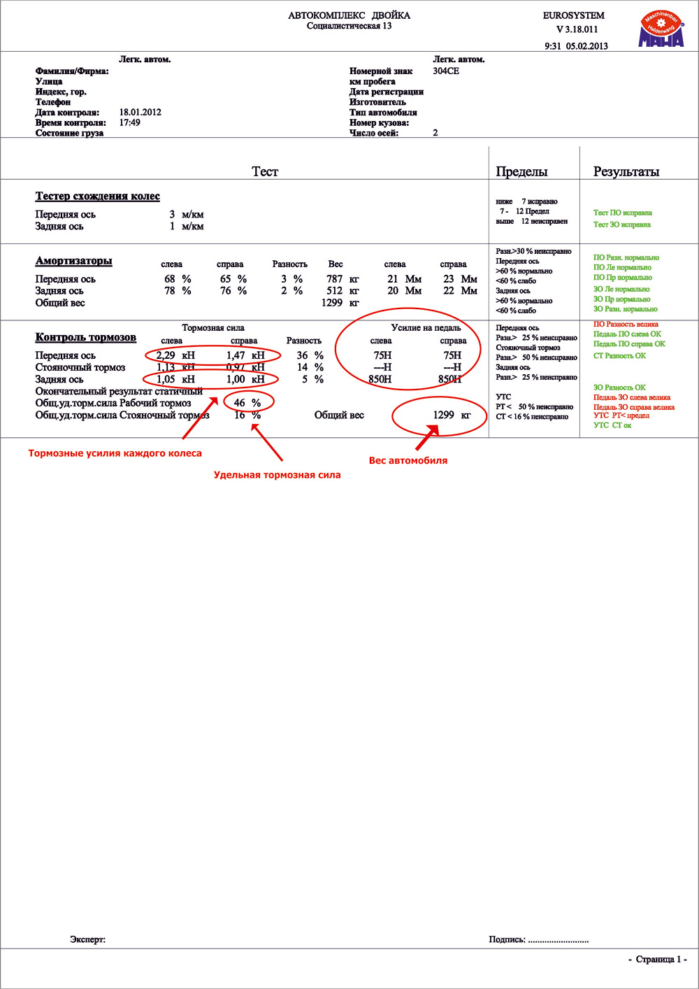 В Автокомплесе «Двойка» после проверки тормозных усилий на стенде вы получаете распечатку с результатами измерений, в которых указаны значения: