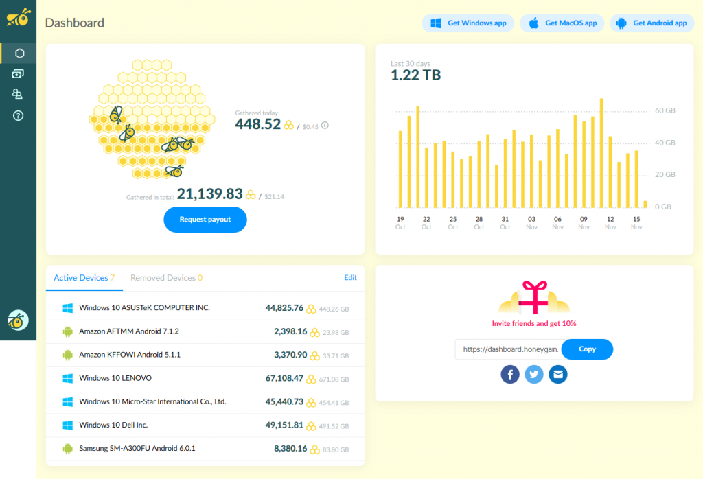 Какой получается заработок? Скрин с моего Dashboard ниже. Время работы сервиса с начала сентября на одном компьютере по LAN и двух телефонах — один по Wi-Fi (как домашний планшет, всегда дома в онлайне), а другой 50/50 Wi-Fi и 4G. Все это с одной сети на 100 Mbit. В октябре я подключил второй стационарный компьютер по LAN к другой сети тоже на 100 Mbit.
