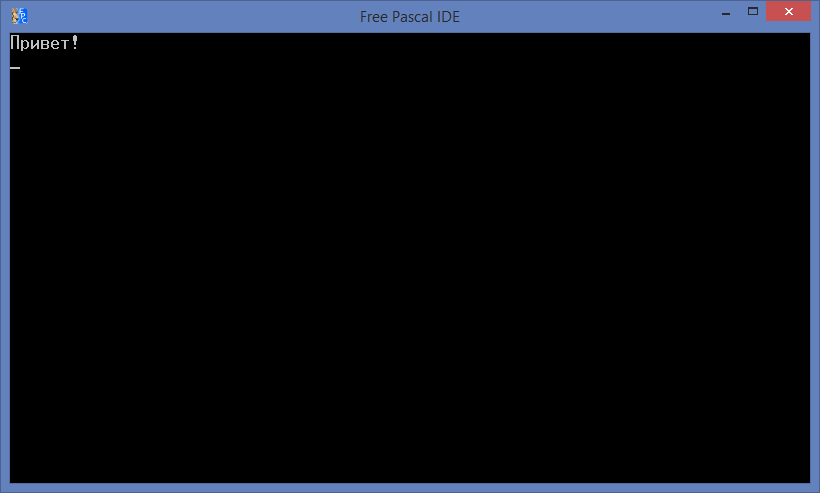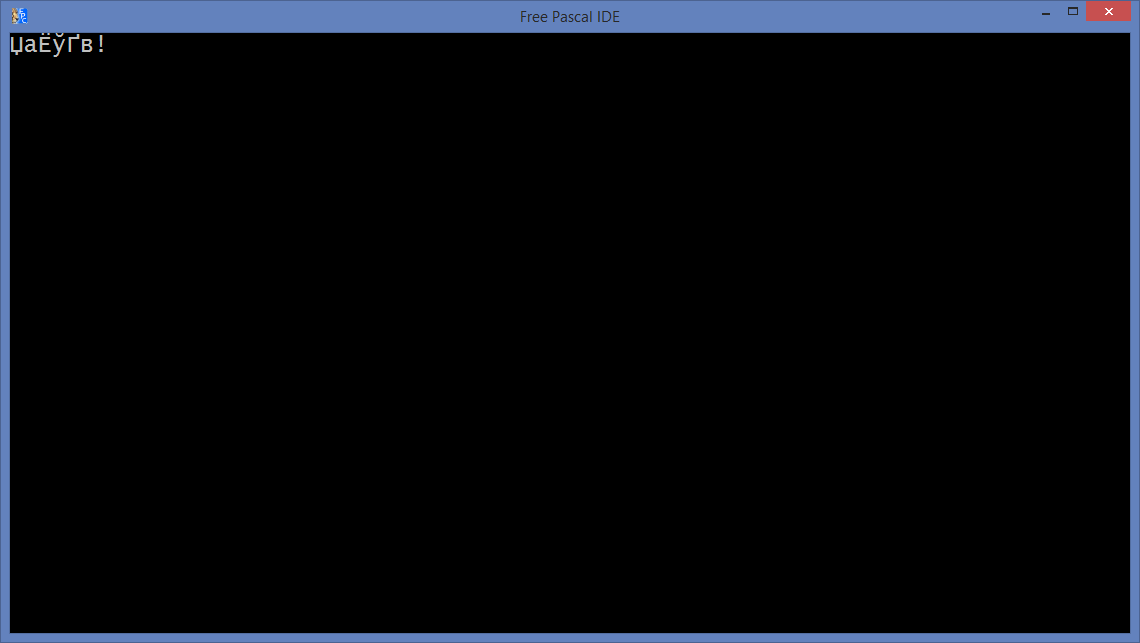 Что ж, на этот раз наша программа запустилась, и даже очистился экран, вот только вместо « Привет! » мы видим на экране какую-то белиберду. Т. е. Free Pascal не отображает русские буквы (кириллицу), если подключен модуль Crt и используется процедура ClrScr (эксперимент показывает, что даже если удалить строку с вызовом процедуры ClrScr , проблема с отображением кириллицы все равно остается).