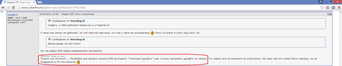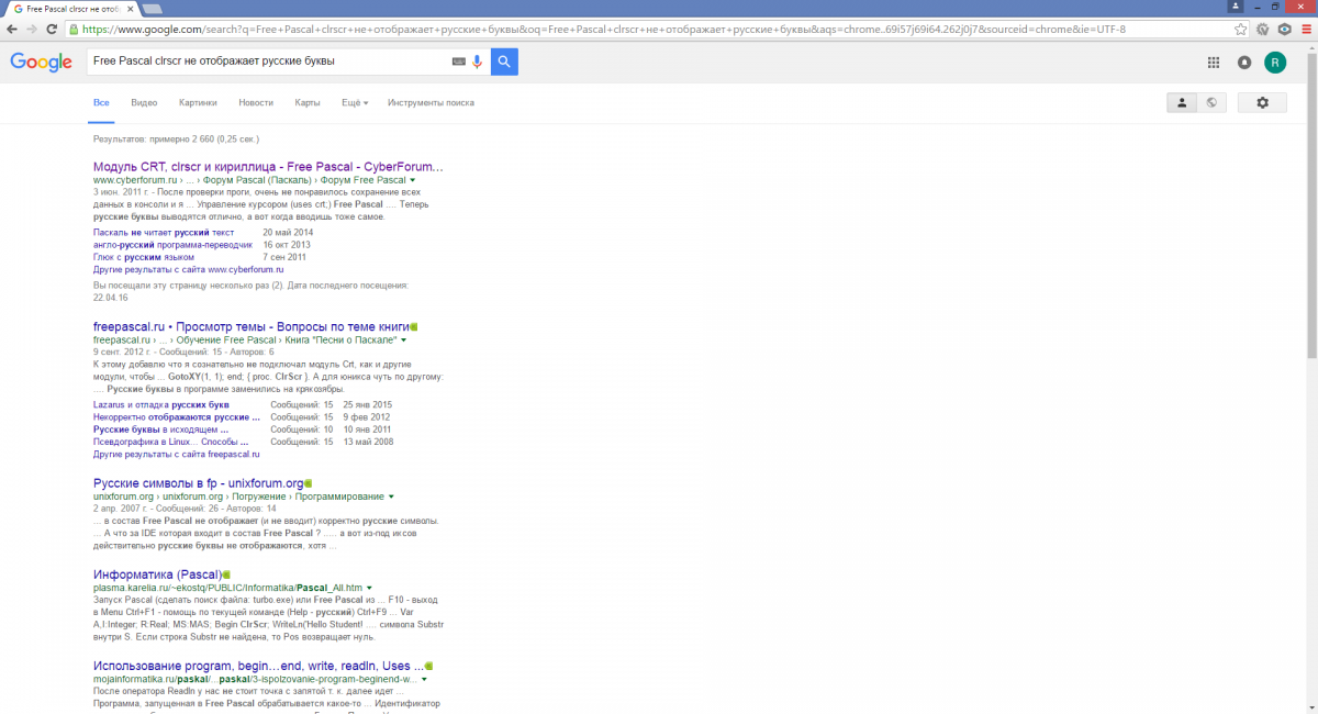 Открываем браузер, и в поисковой строке гугла вбиваем «free pascal clrscr не отображает русские буквы»: