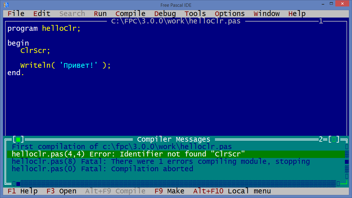 Если ваша предыдущая программа hello.pas закрыта, то откройте её, нажав клавишу F3 (File | Open). Напоминаю, что все наши программы мы сохраняем в папке «C:FPC3.0.0work».