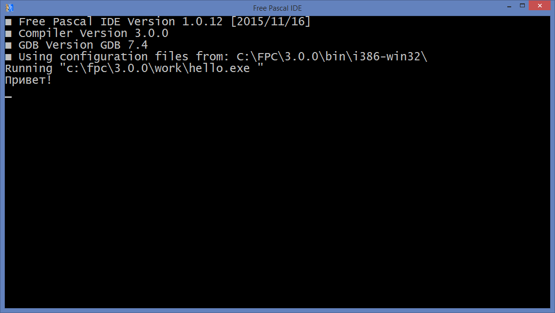 В прошлый раз мы написали программу, которая здоровается с вами, выводя на экран приветственное сообщение «Привет!». Однако переключаясь в окно, где выводятся результаты выполнения программы, мы видели не только сообщение «Привет!», но и целый ряд служебных сообщений, которые Free Pascal выводит во время своего запуска.