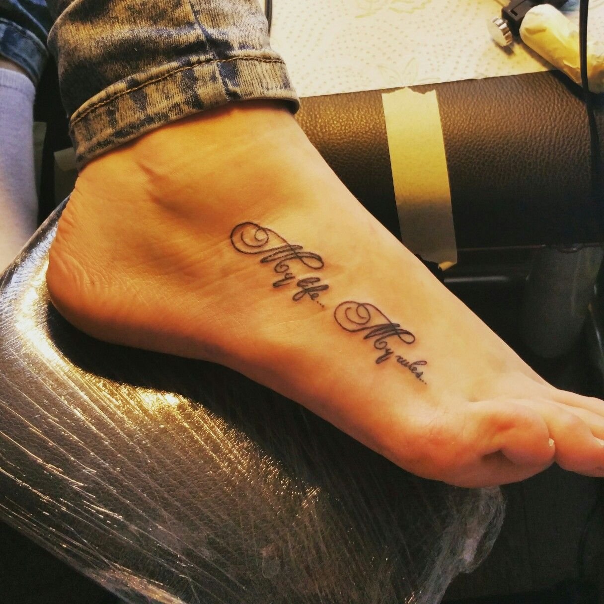 Например, фраза my life my rules: на руке будет смотреться эффектно и удачно. Причем особенно – на внутренней части руки, от запястья до локтя. У девушки эта татуировка будет удачно смотреться на запястье, особенно если будет изящной, миниатюрной, выполненная витиеватым красивым шрифтом. На мужском мускулистом плече слова тоже будут выглядеть весьма внушительно.