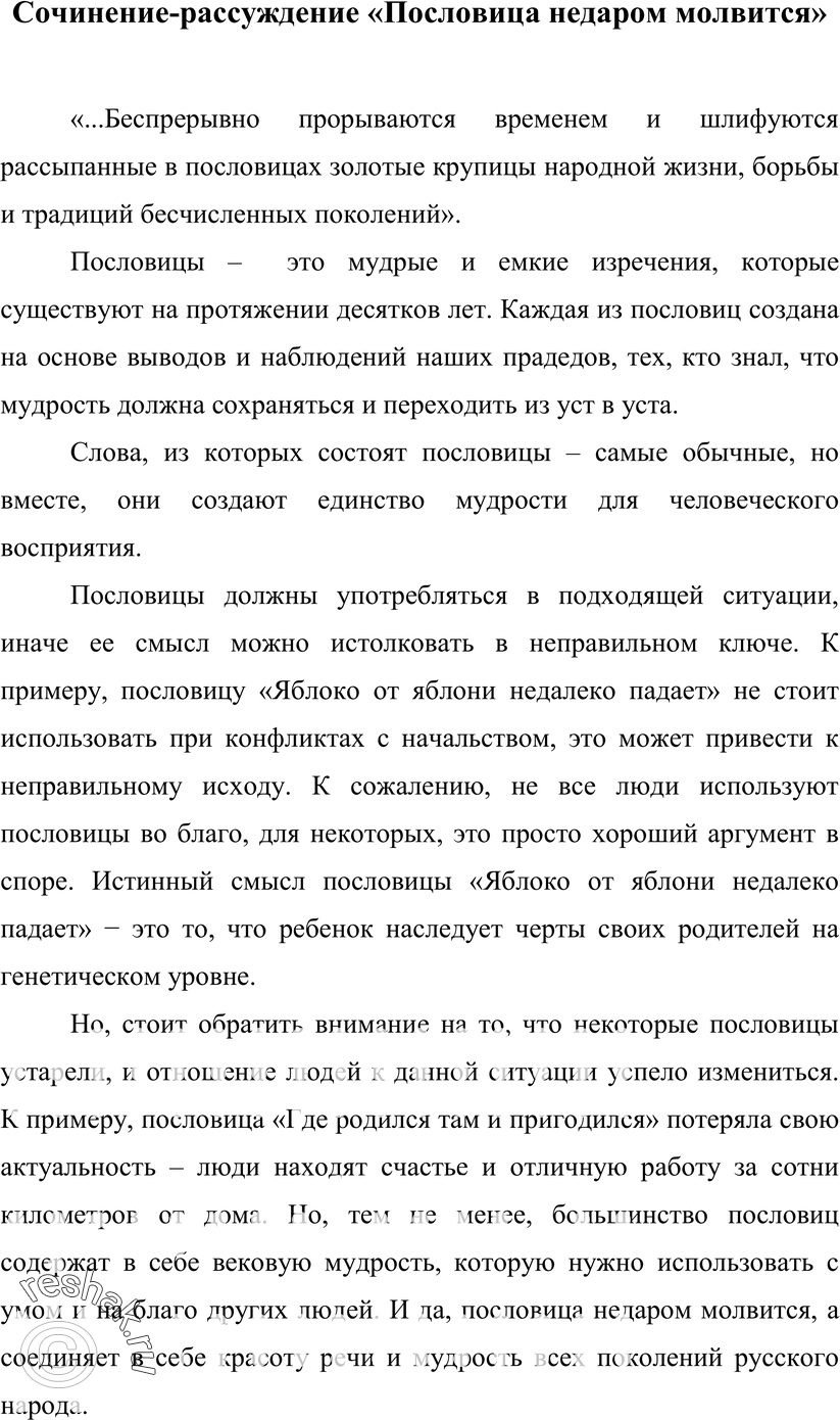 50. Прочитайте высказывание М. Шолохова. Взяв за начало приве- дённую цитату, напишите сочинение-миниатюру по одной из тем: «Пословица недаром молвится», «Пословица вовек не сломится», «Одна речь не пословица». …Беспрерывно промываются временем и шлифуются рассыпанные в пословицах золотые крупицы народной жизни, борьбы и традиций бесчисленных поколений. Пословица недаром молвится «… Беспрерывно промываются временем и шлифуются рассыпанные в пословицах золотые крупицы народной жизни, борьбы и традиций бесчисленных поколений». Почти все известные нам пословицы и поговорки существуют уже не один десяток лет. Многие из них основаны на народной мудрости и наблюдениях. Слова, из которых состоит пословица, внутри нее теряют свое собственное лексическое значение и приобретают его только в связке с другими словами фразеологизма. Однако пословицы следует употреблять с умом. Ведь каждая отдельная пословица не подойдет абсолютно любой ситуации. Пословицы можно подобрать на все случаи жизни, но употреблять их следует с умом. К примеру, пословица «За двумя зайцами погонишься – ни одного не поймаешь» нельзя применить к ситуации, когда старший учит младшего, или ссорятся два друга. Данную пословицу можно применить только к ситуации, когда человек пытается сделать несколько дел, и в итоге не может добиться успеха ни в одном. Тогда как на две другие, приведенные нами в пример ситуации, можно найти свои пословицы, а иногда даже и не одну. Однако стоит заметить, что есть и такие пословицы, которые в настоящее время уже не имеют смысла, поскольку изменилось отношение к той ситуации, которую она описывает. Например, пословица «добрый совет дороже денег» в настоящее время не всегда может быть к месту. Совет дорог, когда его просят. Однако зачастую люди, употребляющие данную пословицу считают, что их совет важен всегда и всем, забывая, что это абсолютно не так. Как мы увидели, пословицы, несмотря на свою долговечность, все еще играют важную роль в речи и взаимодействии современного человека. Однако их употребление должно быть к месту. Не стоит разбрасываться фразеологизмами по любому поводу и без. Сочинение-рассуждение «Пословица недаром молвится» «…Беспрерывно прорываются временем и шлифуются рассыпанные в пословицах золотые крупицы народной жизни, борьбы и традиций бесчисленных поколений». Пословицы – это мудрые и емкие изречения, которые существуют на протяжении десятков лет. Каждая из пословиц создана на основе выводов и наблюдений наших прадедов, тех, кто знал, что мудрость должна сохраняться и переходить из уст в уста. Слова, из которых состоят пословицы – самые обычные, но вместе, они создают единство мудрости для человеческого восприятия. Пословицы должны употребляться в подходящей ситуации, иначе ее смысл можно истолковать в неправильном ключе. К примеру, пословицу «Яблоко от яблони недалеко падает» не стоит использовать при конфликтах с начальством, это может привести к неправильному исходу. К сожалению, не все люди используют пословицы во благо, для некоторых, это просто хороший аргумент в споре. Истинный смысл пословицы «Яблоко от яблони недалеко падает» ? это то, что ребенок наследует черты своих родителей на генетическом уровне