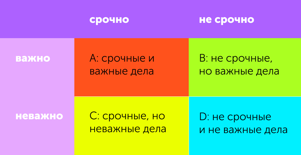 Нарисуйте квадрат и разделите его на 4 части: вертикальная ось будет обозначать важность дел, а горизонтальная — их срочность. Так у вас получится 4 квадрата: