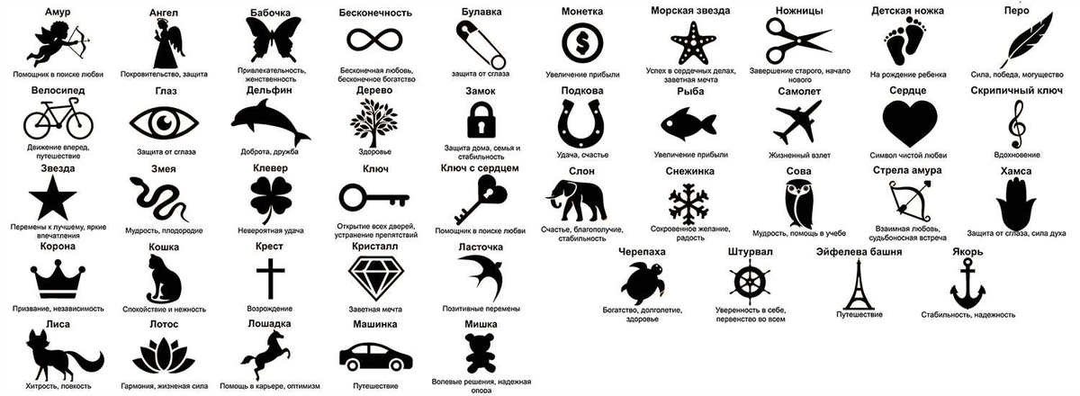 Все символы, используемые в татуировках, имеют свое значение и могут передавать различные смыслы. Например, изображение льва может олицетворять смелость, силу и решительность. Татуировка с изображением орла может символизировать свободу, власть и бессмертие. В то же время, ветвь оливы часто используется в качестве символа мира и спокойствия.